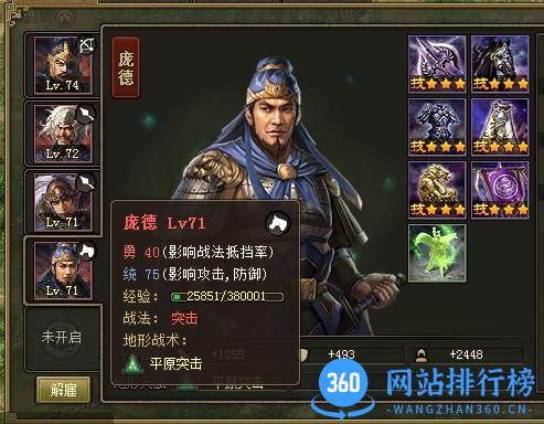 要说的第三个武将就是“夏侯惇”,这位东汉末年曹操部下大将,汉朝开国功臣之一夏侯婴的后代,在攻城掠地中也是威武无比,战法“飞羽”一出,直穿敌人4排兵。在可以招募以上几位武将之时,就果断招募。但美中不足的是,夏侯惇的“勇”比较低,易被格挡。