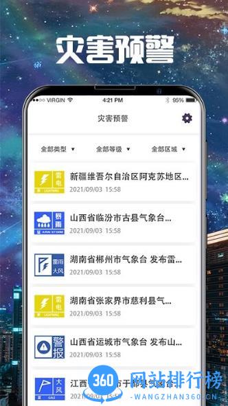 3、 其实定位天气可查,全球城市天气预报快速受到全国地区灾害和预警新闻。免费查询使用。还有地图导览,遥感行业专用,天气观察等各种功能。