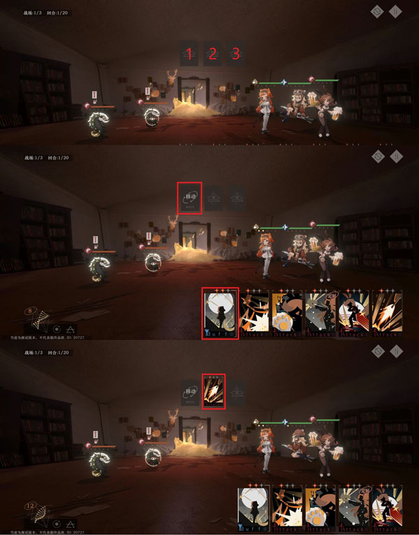 每回合的行动次数视在场人数而定。如图所示,我方当前场上有三人。所以本回合我们可以行动三次。每次选择使用或者移动卡牌都需要消耗一点行动点。