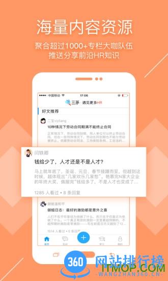 三茅HR App是深圳茅庐信息科技有限公司打造的一款针对于HR、职场人士学习社交类移动应用。24小时滚动刷新的行业资讯、深度HR专题栏目,汇聚280万多万HR精英圈子分享人力资源从业经验。