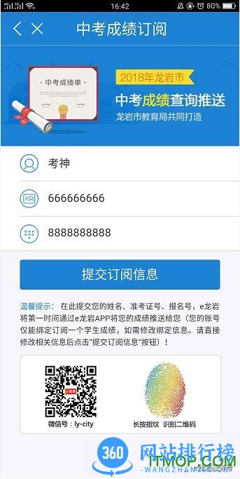 3、输入正确考生姓名、准考证号及报名号后“提交订阅信息”,即可绑定考生。中考成绩公布后,系统将第一时间推送成绩。