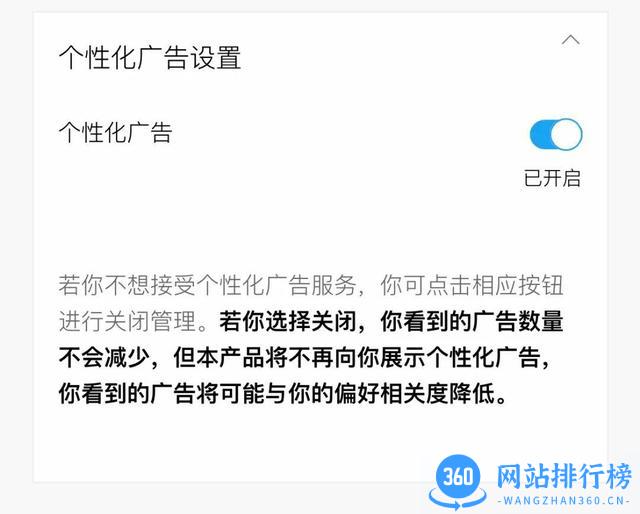 在这里微信加入了个性化广告的功能开关,虽然能关闭,但并不代表你在微信看到的广告数量会减少,而是不会再向你展示个性化广告,广告与自己的偏好相关度降低,如图所示: